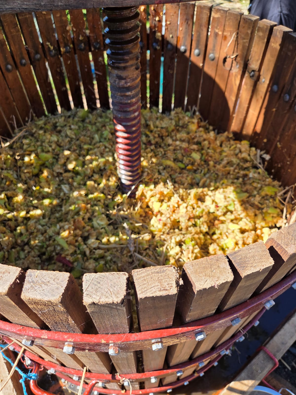Sur l’espace, devant la mairie, l’ambiance de cette demi-journée du samedi 11 octobre est à la fête de l’automne. Tous les éléments y sont : paysages sonores, images de patrimoine, atmosphère du jour. Le claquement métallique du brise-pommes hache l’après-midi par épisodes courts. Adossé à son tapage récurrent clapote le cliquetis retrouvé du pressoir. Le jus de pommes coule clair et limpide. Plus loin, derrière l’écran de fumée du brasero, l’odeur appétissante des marrons grillés. Juste à côté, les cuisinières du jour proposent des crêpes chaudes, confiture ou chocolat.